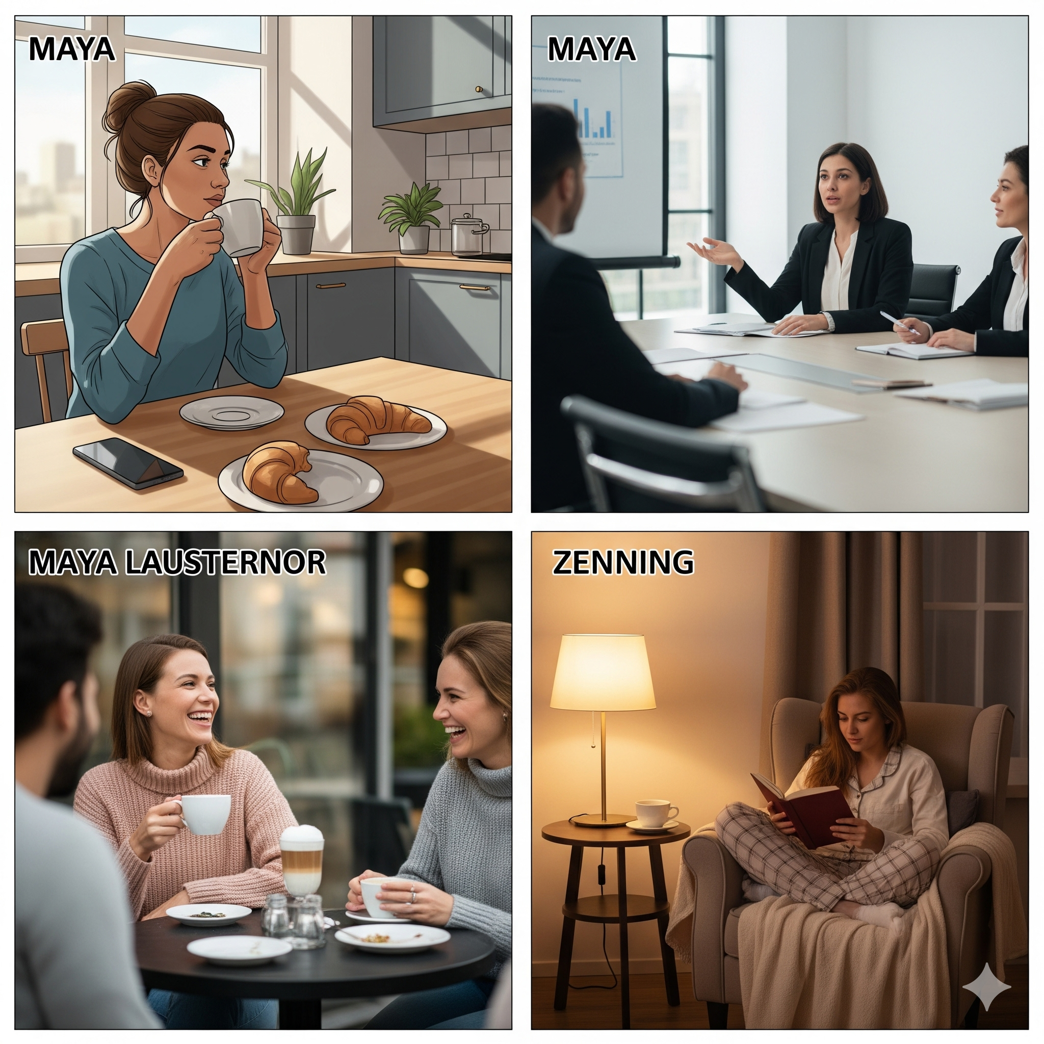 Maya, casual chic outfit, genuine laughter, relaxed atmosphere,