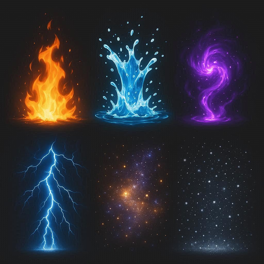 [파티클 타입] + [움직임 패턴] + [발광/색상] + [밀도/크기] + [상호작용]
